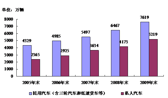 据公安部交通管理局最新消息,截至2009年底,我国汽车保有量已达到6200万辆。如果把三轮汽车、低速货车、农用车包括在内,截至2009年底,我国民用汽车保有量已达7619万辆,比上年末增长17.8%。其中私人汽车保有量5218万辆,增长25.0%;民用轿车保有量3136万辆,增长28.6%,其中私人轿车2605万辆,增长33.8%。